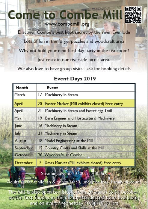 Combe Mill Steaming Days offer visitors a unique and special day out for all the family including the dog. Interactive, fun and educational for the kids and adults alike. We have a Cornish Boiler, Beam Engine and water wheel to name a few of the attractions plus an extraordinary opportunity to have a go at blacksmithing where you can get hands on. There is a find Millie the mill cat trail for the little ones. The volunteers have a wealth of knowledge and experience and are on hand to explain and answer questions. Also there is a bit of shopping, homemade cakes and tea at the tearoom and a lush meadow on the banks of the River Evenlode to picnic, where you might spot our local otter if you are lucky.