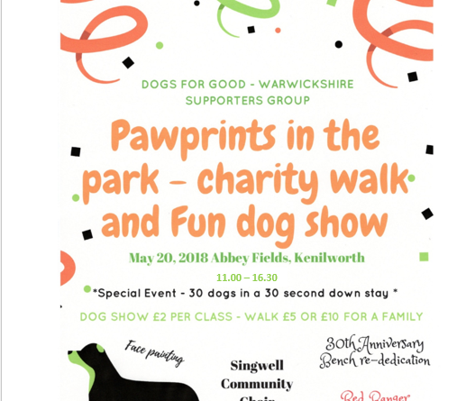 Dogs for Good (charity 1092960) is 30 years old this year and to celebrate the Warwickshire Supporters Group are holding a special event at Abbey Fields, Forrest Road, Kenilworth. The event, Pawprints in the Park will start at 11.00 with a re-dedication of a memorial bench to our Founder Frances Hay. At 11.30 the charity walk will commence (with or without a dog) including a picture treasure hunt for children. There is musical entertainment from Singwell community choir and catering facilities from Red Banger Catering. Face painting, tombola, merchandise, games. Fun for all the family. At 13.45 the Fun Dog Show begins with 8 classes to choose from. Class 5 is a special event where we are trying to get 30 dogs in a 30 second down stay – this class is free to enter.
